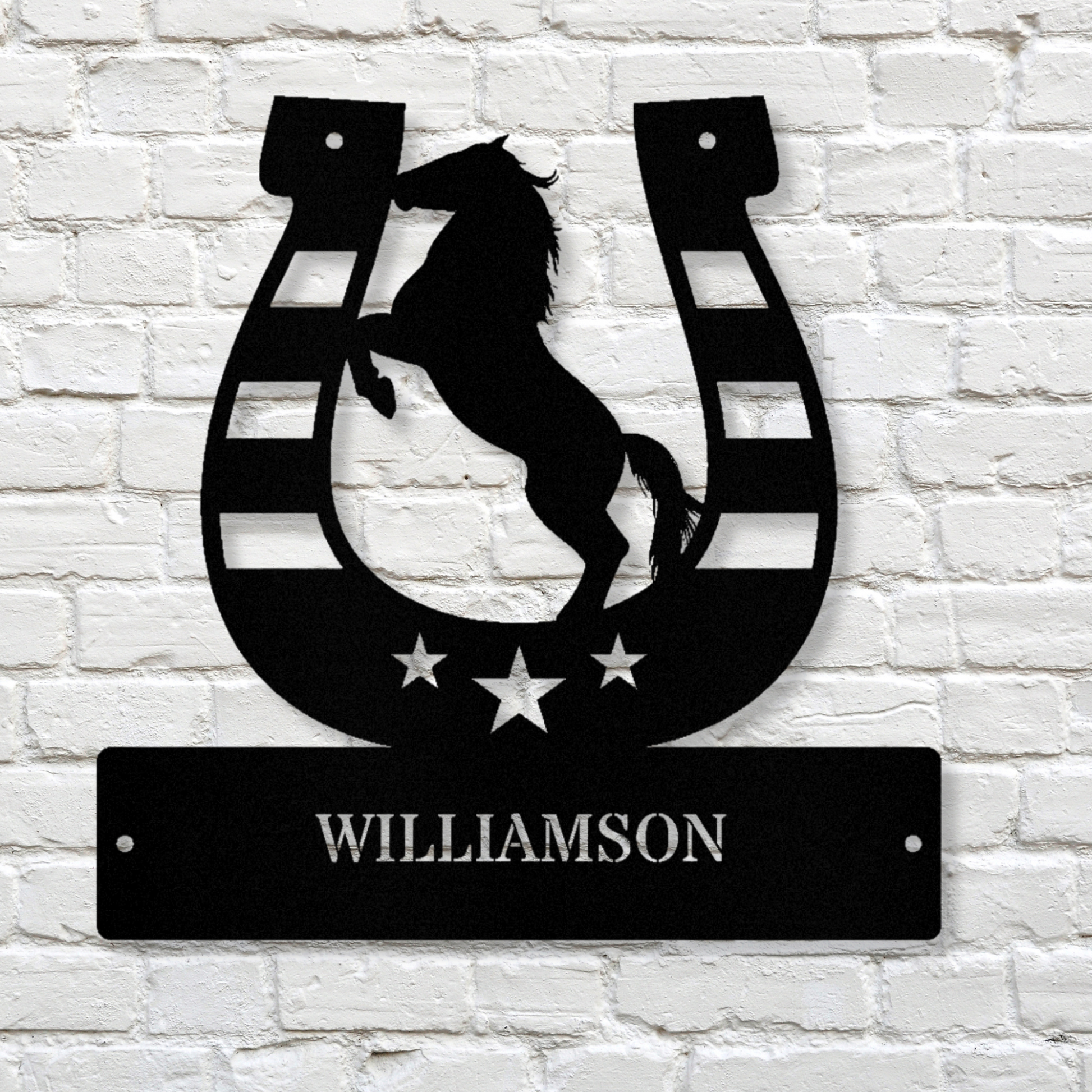 Customized Horseshoe Metal Sign, Last Name Metal Sign, American Flag Horseshoe Sign, Horse Farm Sign, Rustic Western Decor, Country Home Décor