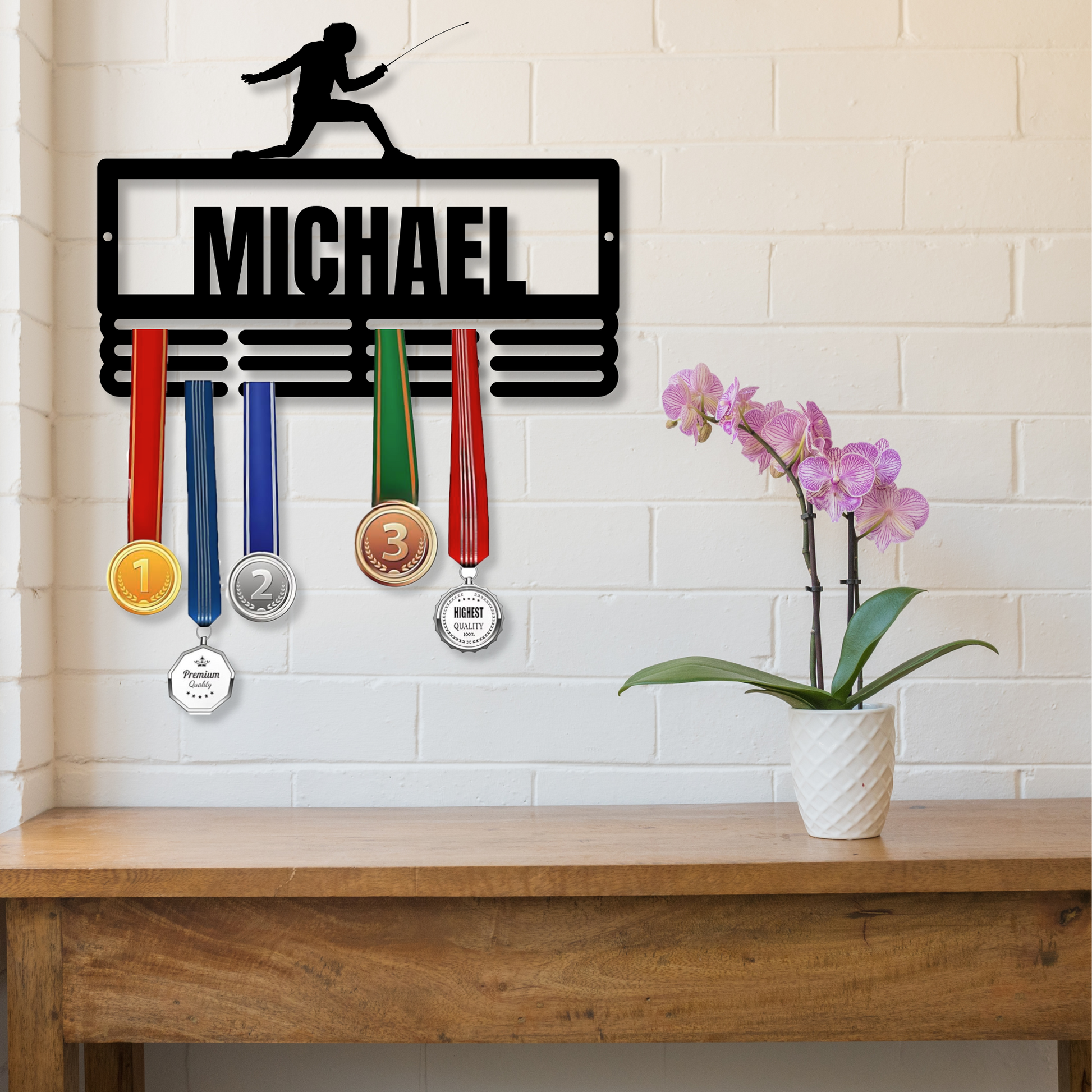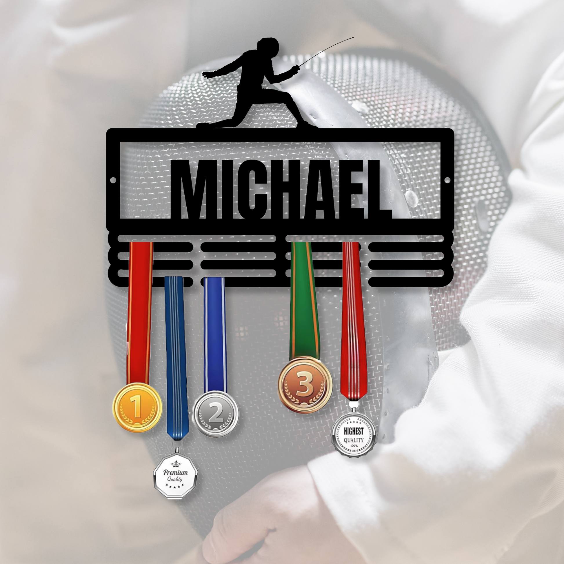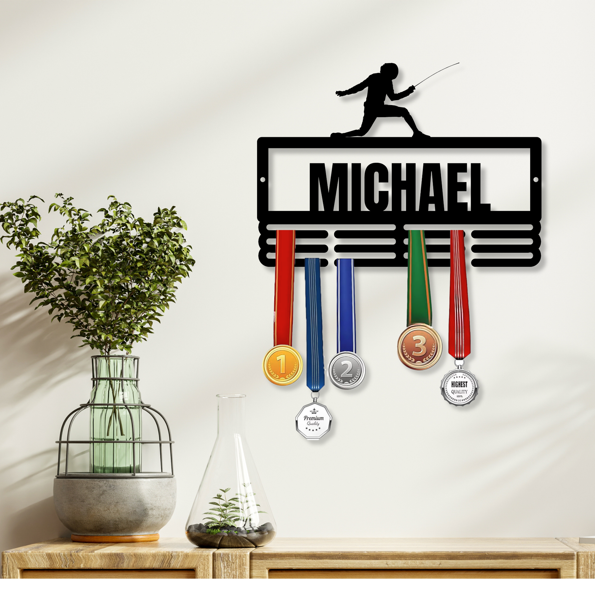Custom Fencing Medal Hanger Metal Sign, Fencer Medal Holder Display Rack, Personalized Fencing Sports Gifts