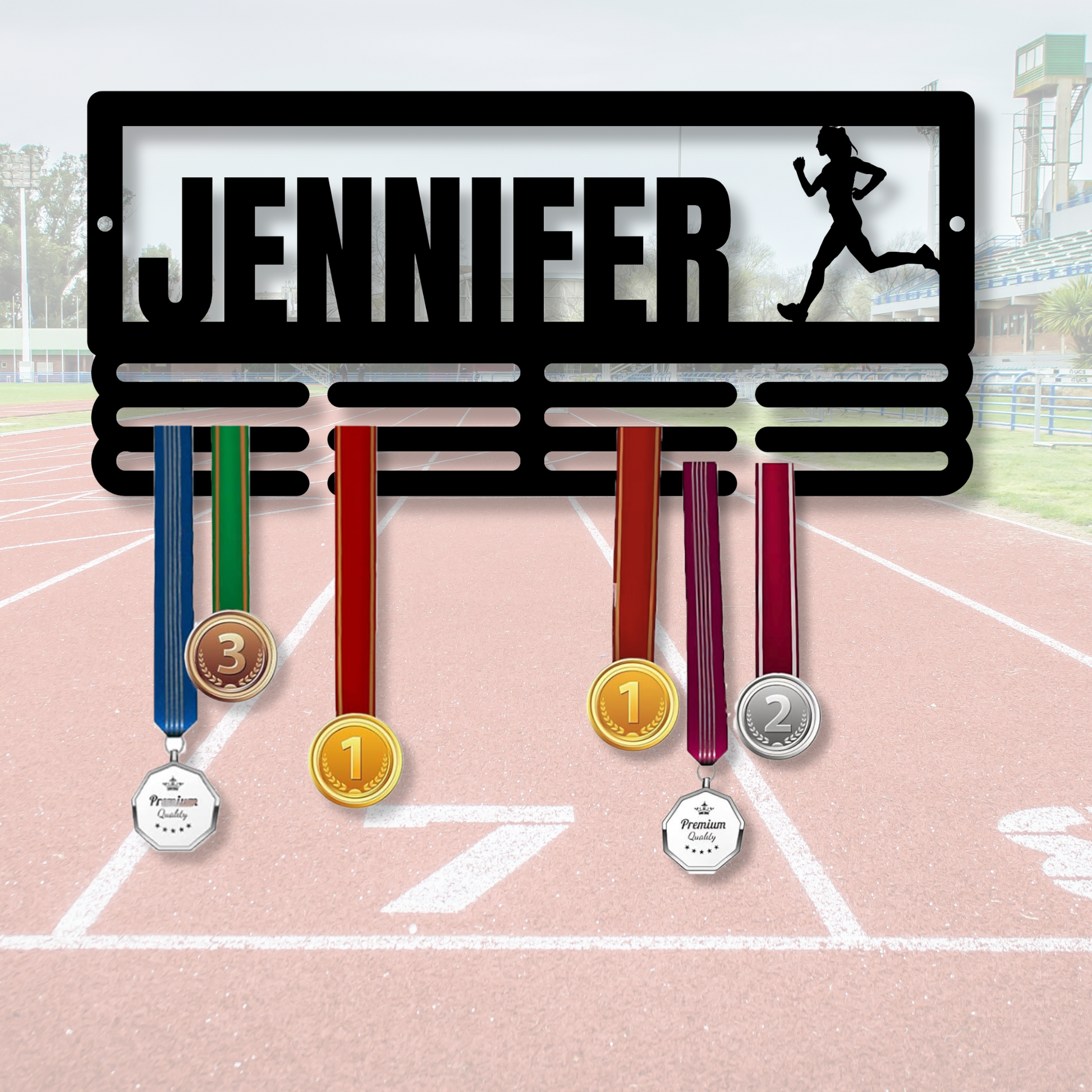 Personalized Track Medal Holder Metal Sign, Custom Runner's Name Medal Holder