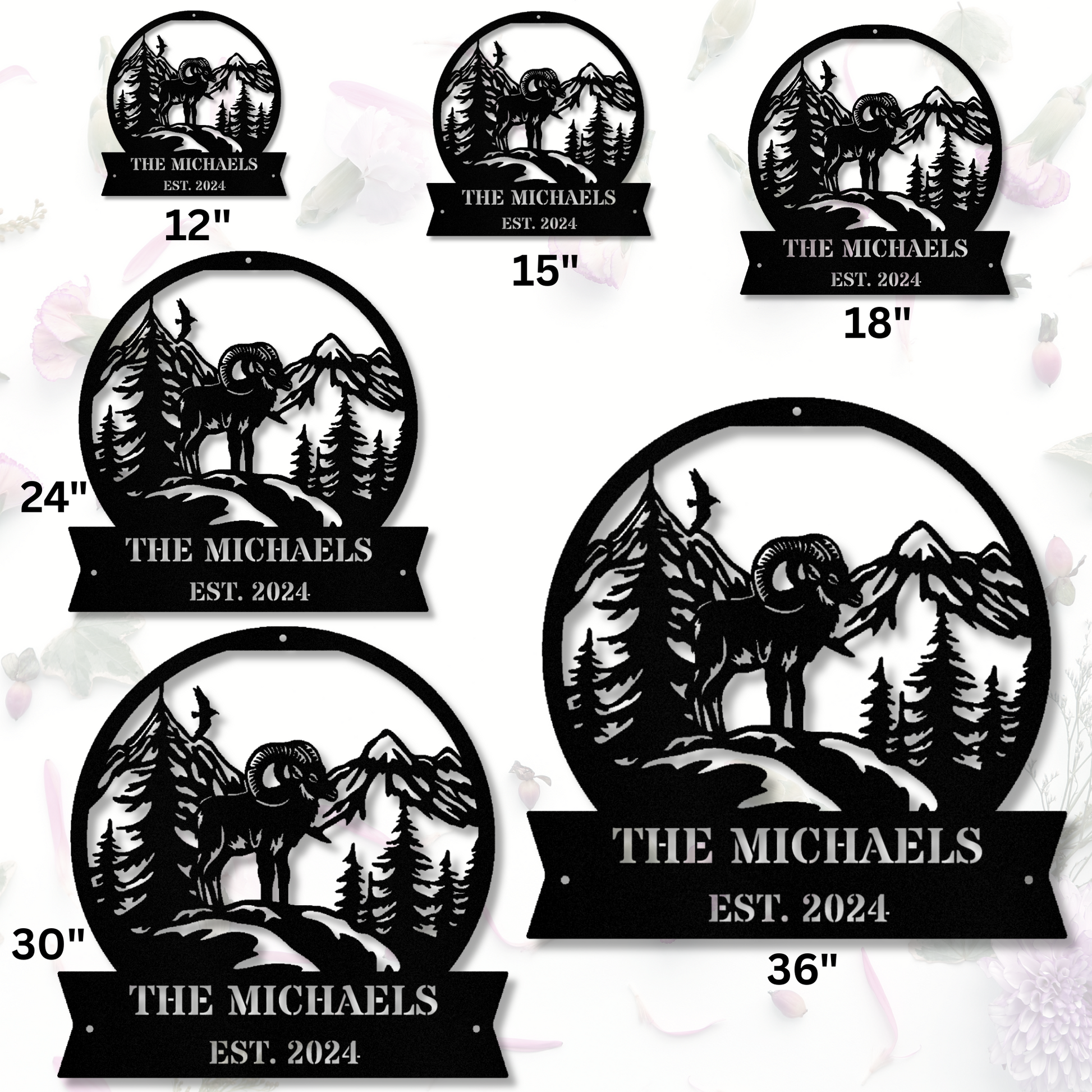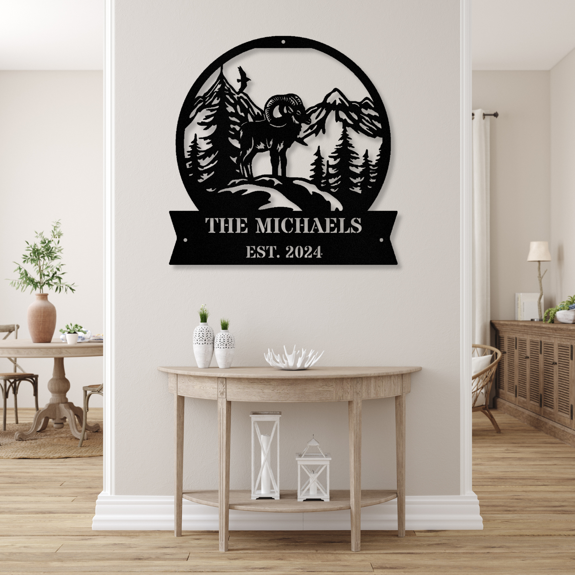 Custom Bighorn Goat Metal Sign, Mountain Cabin Metal Sign, Last Name Sign, Address Sign, Mountain Goat Wall Decor, Housewarming Gift