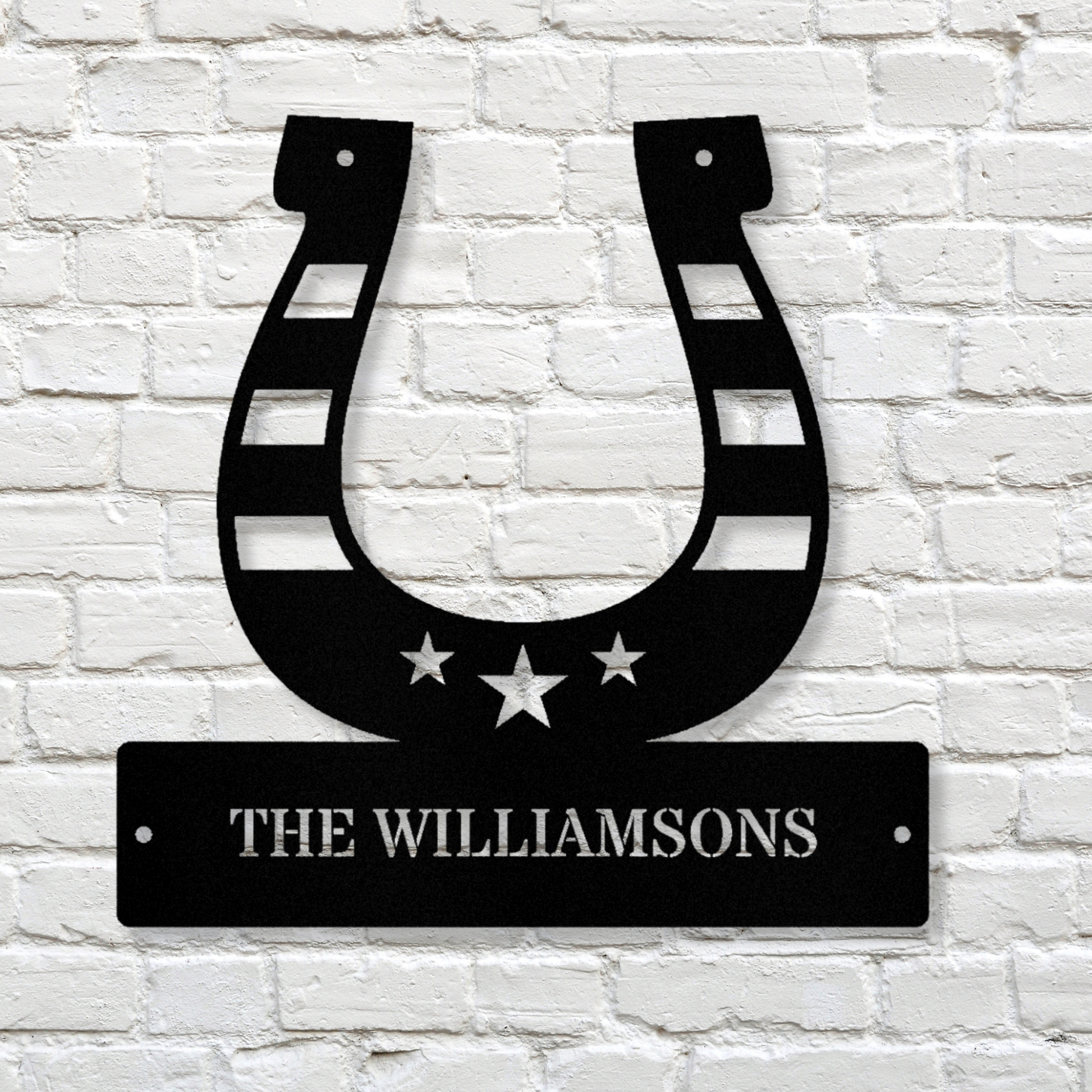 Custom Horse Shoe Metal Sign, American Flag Horseshoe Sign, Horse Farm Metal Sign, Last Name Metal Sign,