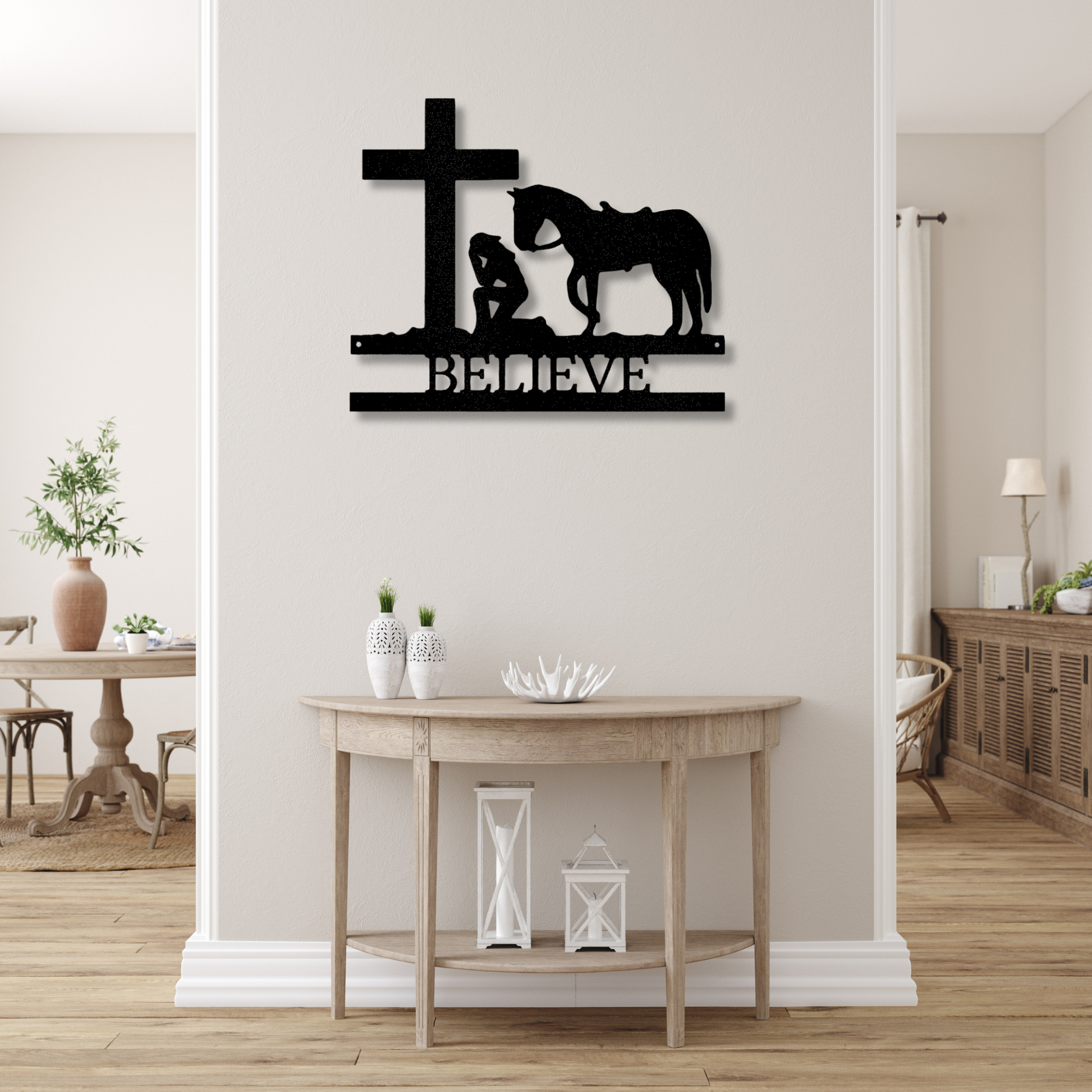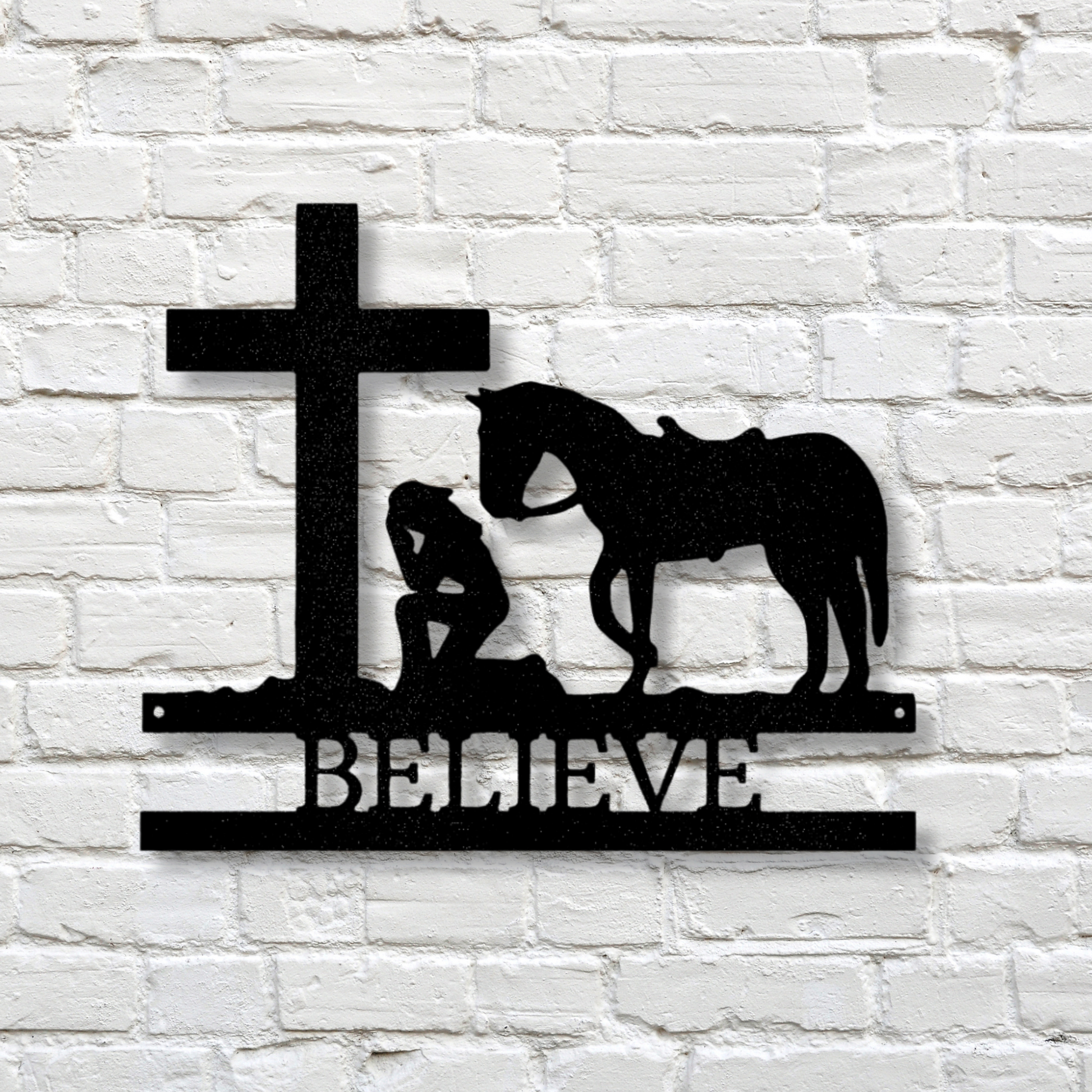 Personalized Praying Girl With A Horse Metal Steel Sign, Kneeling Girl At A Cross Custom Sign, Religious Farm Decor, Memorial Signs, Custom Ranch Hangings