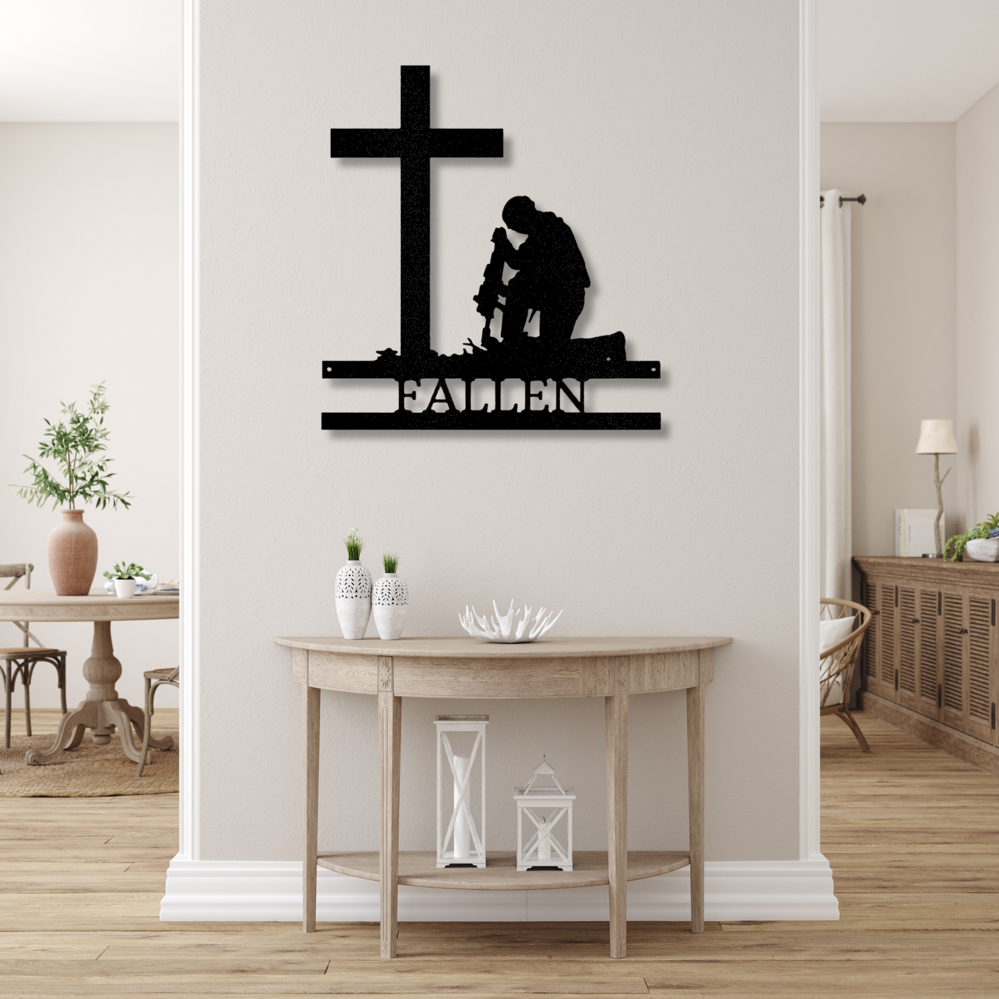 Kneeling Soldier Monogram Metal Sign, Cross Metal Sign, Veteran Gift, Fallen Soldier Gift, Religious Gift, Living Room Decor, Army Navy Gift